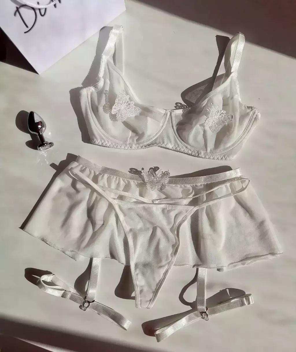 Confeccionado em tule transparento, sutiã com aro de sustentação, alças mais grossaa e ajustáveis. Acompanha cinta estilo mini saia com regulagem atrás. Calcinha de tule com laterais fininhas e fio atrás.